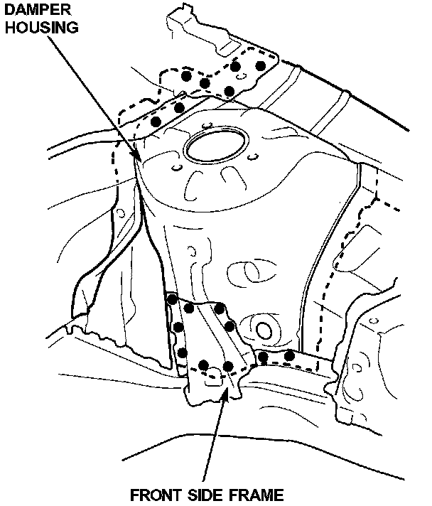 - Check the front damper extension and damper housing position, and check for damage. If necessary, remove the wheelhouse upper member, and replace the damper housing and front damper extension as an assembly, if possible.