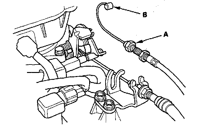 1. Loosen the locknut (A), then disconnect the actuator cable (B) from the throttle linkage.