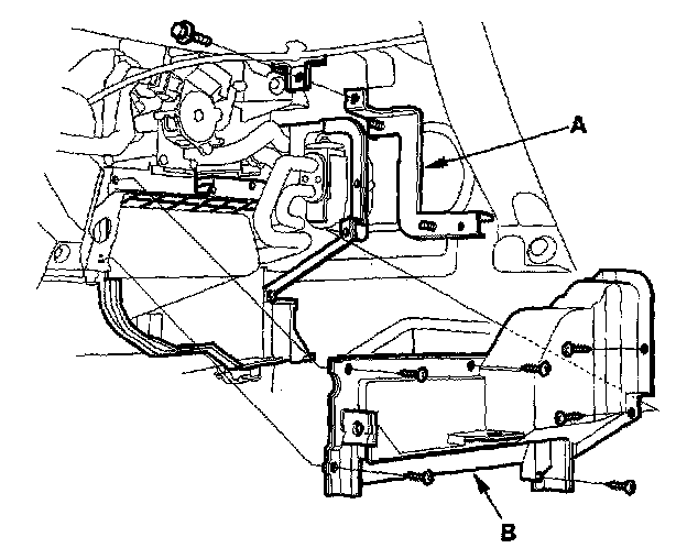 4. Remove the bolt and the ECM/PCM bracket (A). Remove the self-tapping screws and the expansion valve cover (B).