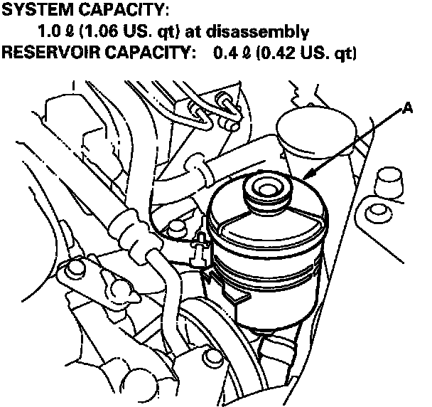 ReplacementCheck the reservoir (A) at regular intervals, and add the recommended fluid as necessary. Always use Honda Power Steering Fluid. Using any other type of power steering fluid or automatic transmission fluid can cause increased wear and poor steering in cold weather.