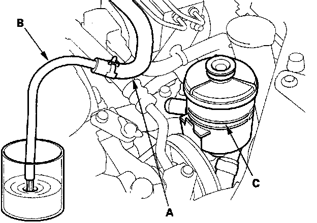 3. Start the engine, let it run at idle, and turn the steering wheel from lock-to-lock several times. When fluid stops running out of the hose, shut off the engine. Discard the fluid.