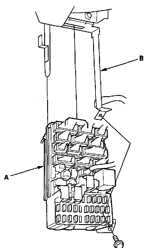 5. Remove the mounting bolt and slide the under-dash fuse/relay box (A) down from the bracket (B).