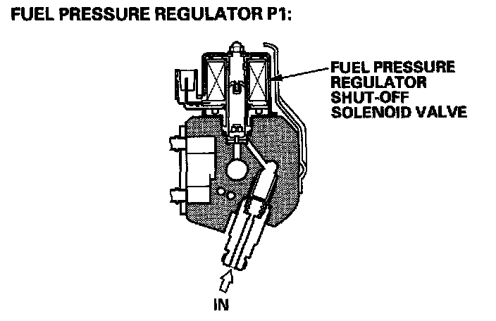The fuel pressure regulator shut-off solenoid valve is located on the fuel pressure regulator P1. It turns on or off to supply fuel to the engine.