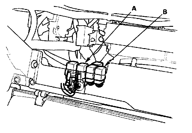 17. Remove the glove box, then remove PCM-FI main relay 1(A) and the injector relay (B).