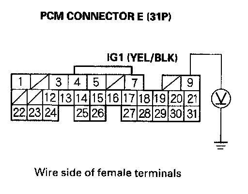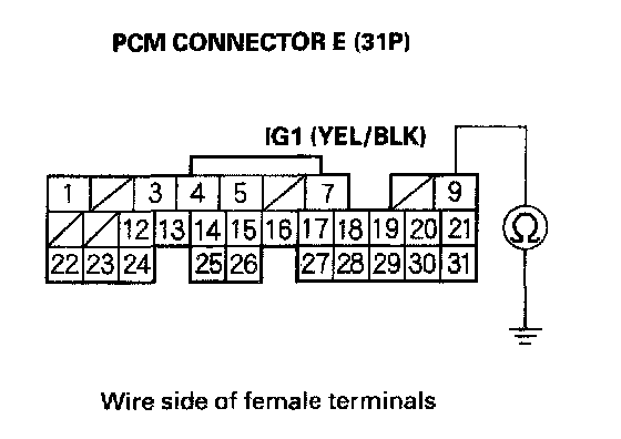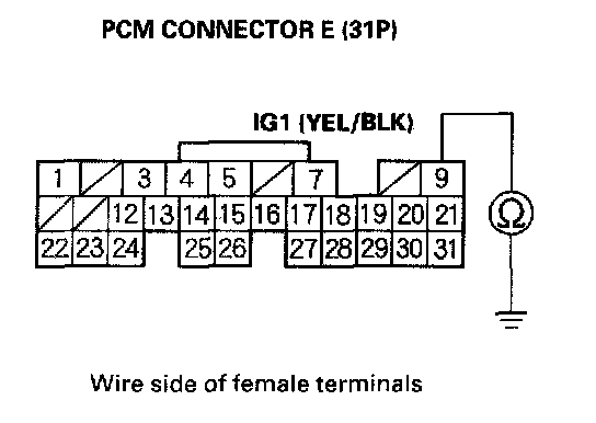 27. Check for continuity between PCM connector terminal E9 and body ground.