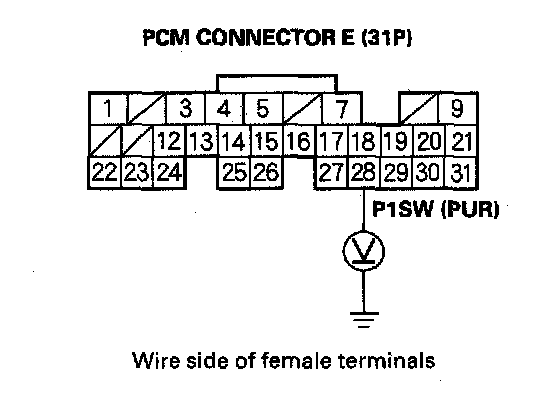 6. Measure voltage between PCM connector terminal E28 and body ground.