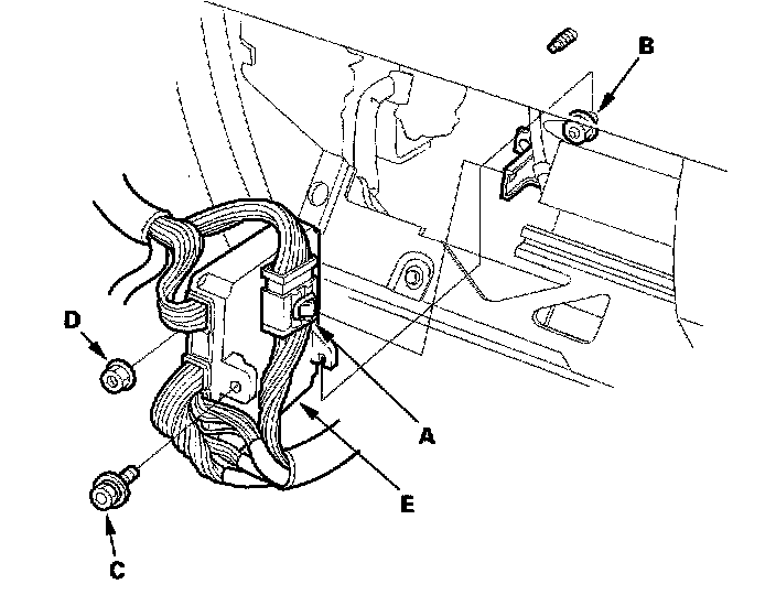 4. Lift the PCM up to clear the mounting nut on the lower right of the PCM, then pull out the PCM (E).