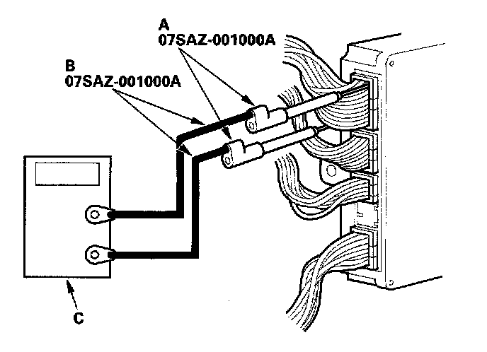 5. Connect the backprobe adapters (A) to the stacking patch cords (B), and connect the cords to a multimeter (C).