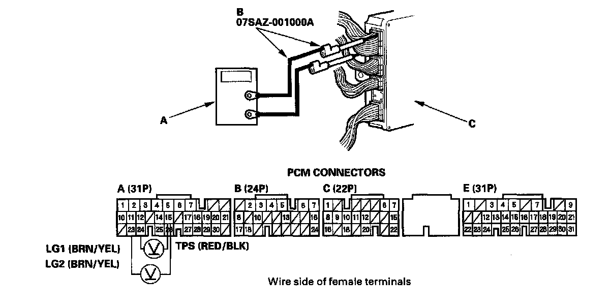 8. Connect a digital multimeter (A) and the special tools (B) to check voltage between the A15 (+) terminal and A23 (-) or A24 (-) terminal of the PCM (C).