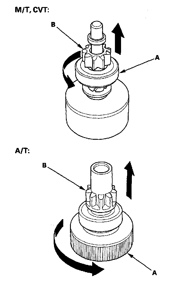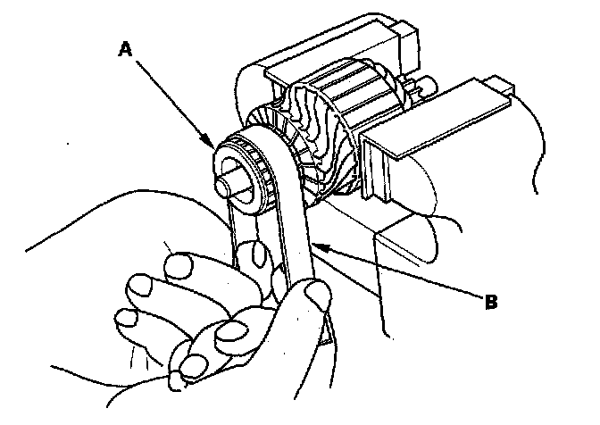 21. If the starter drive gear (B) is worn or damaged, replace the overrunning clutch assembly; the gear is not available separately.