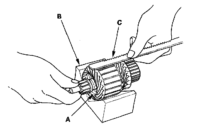 9. Place the armature (A) on an armature tester (B). Hold a hacksaw blade (C) on the armature core. If the blade is attracted to the core or vibrates while the core is turned, the armature is shorted. Replace the armature.