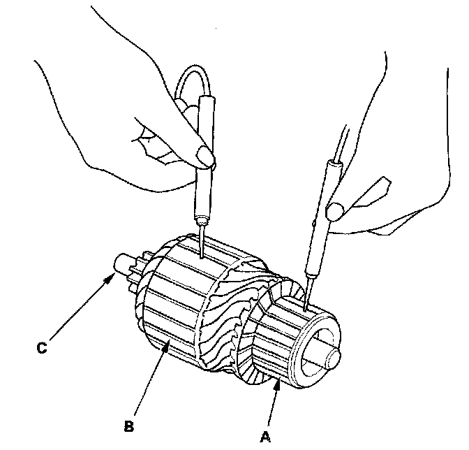 10. Check with an ohmmeter for continuity between the commutator (A) and armature coil core (B), and between the commutator and armature shaft (C). If there is continuity, replace the armature.