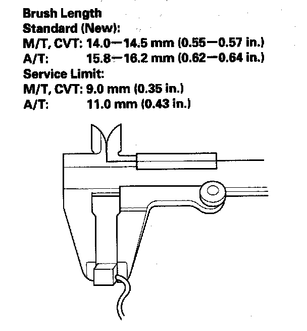 11. Measure the brush length. If it is not within the service limit, replace the armature housing assembly (M/T, CVT), or the brush holder assembly (A/T).