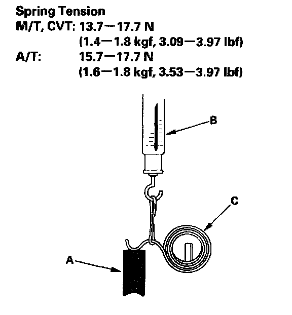 15. Insert the brush (A) into the brush holder, and bring the brush into contact with the commutator, then attach a spring scale (B) to the spring (C). Measure the spring tension at the moment the spring lifts off the brush. If the spring tension is not to specification, replace the spring.