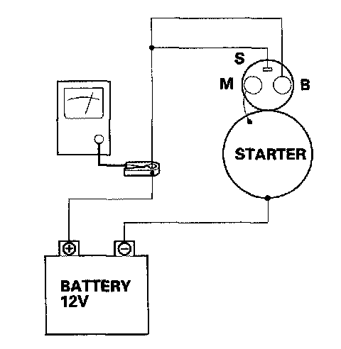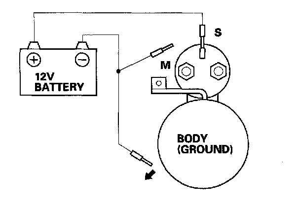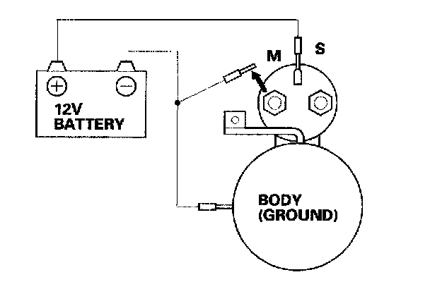 3. Connect the battery as shown. Make sure you disconnect the starter motor wire from the solenoid If the starter pinion moves out, it is working properly.