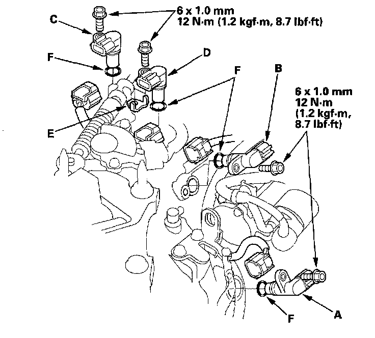 2. Remove the 6 mm bolts, then remove the speed sensors. Remove the sensor washer (E) from the vehicle speed sensor (C).