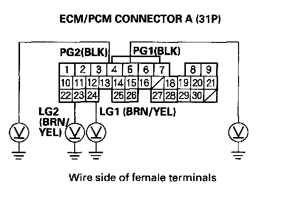 25. Check for continuity between ECM/PCM connector terminal E9 and body ground.