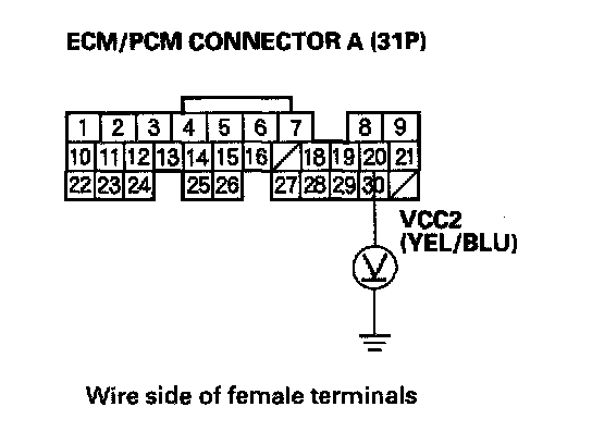 44. Measure voltage between body ground and ECM/PCM connector terminals A2 and A3 individually.