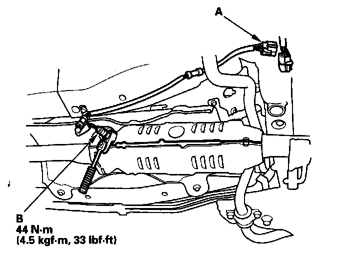 1. Disconnect the third HO2S 4P connector (A), then remove the third HO2S (B).