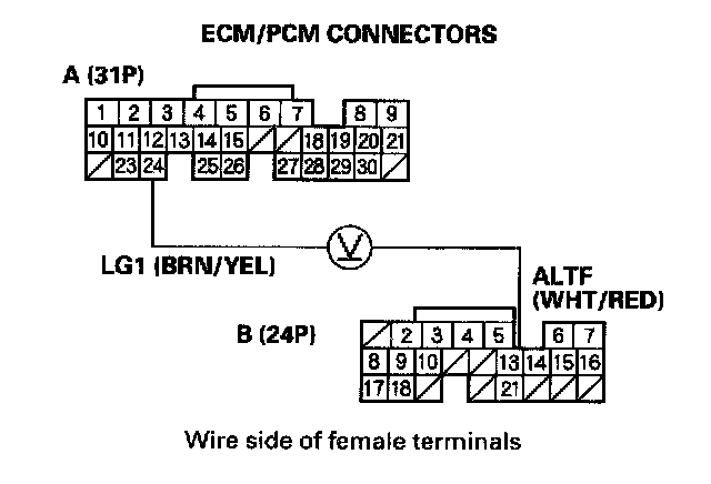 3. Measure voltage between ECM/PCM connector terminals A24 and B13.