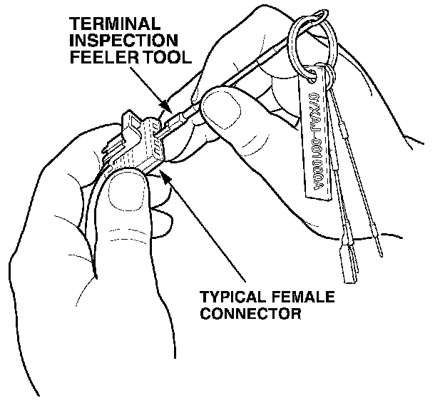 CHECKING FOR POOR FIT OF TERMINALSLoose terminal fit can cause a number of intermittent problems in electrical circuits. By using the Terminal Inspection Feeler Tool Set you can inspect the terminal fit between the two matching connectors without removing the terminals from the connector body.
