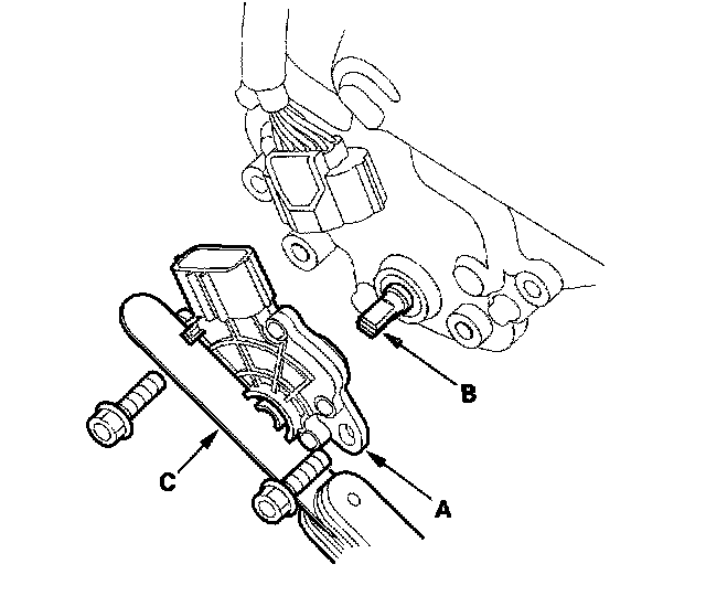 7. Align the cutouts (A) on the rotary-frame with the neutral positioning cutouts (B) on the transmission range switch, then put a 2.0 mm (0.08 inch) feeler gauge blade (C) in the cutouts to hold it in the N position.