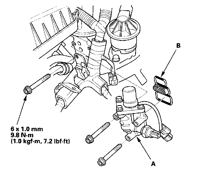 5. If the filter is not clogged, remove the VTEC solenoid valve (A), and push the VTEC valve (B) with your finger to check its movement. If the VTEC valve moves, check the engine oil pressure.