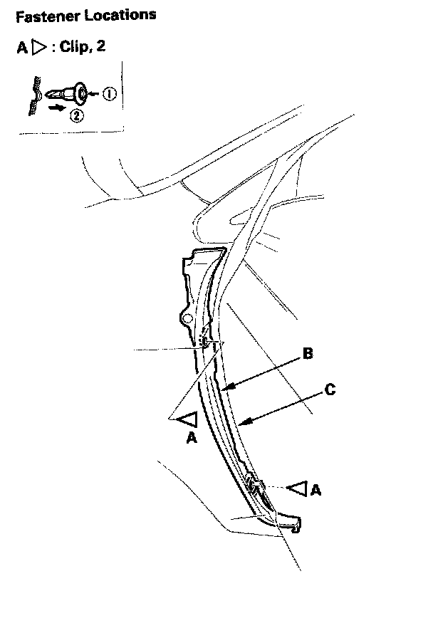 2. Open the front door. From outside the door, remove the upper clip (A), and from inside the door, remove the lower clip (A) securing the front fender fairing (B) and front fender (C).