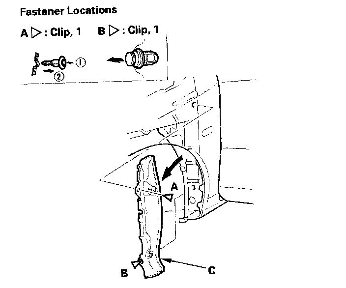 3. From the wheel arch, remove the clip (A), and release the clip (B), then remove the front fender fairing (C).