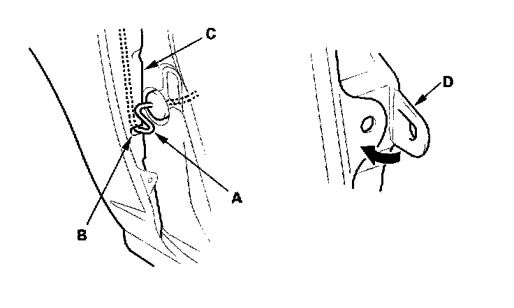 - Before installing the upper and lower clips, bend the mounting tabs (D) on the fender fairing into position as shown.