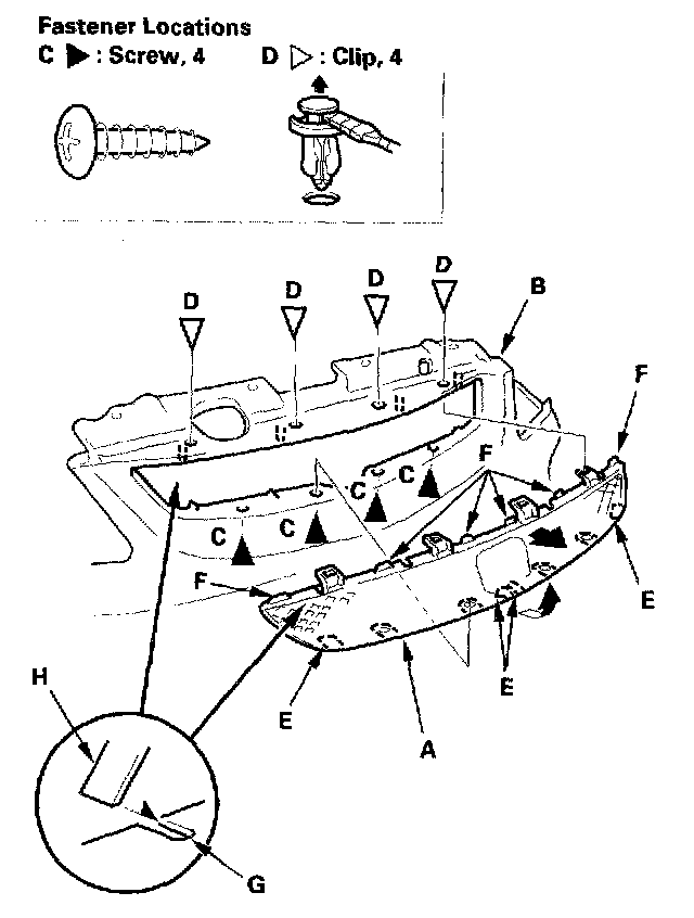 5. Pull out the grille to release the slits (G) from the ribs (H), then remove the grille.