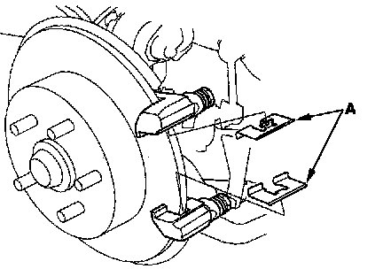 4. Remove the pad retainers (A), and check the caliper pins for free movement.