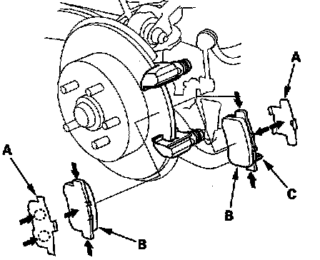 10. Install the brake pads and pad shims correctly. Install the pads with the wear indicators (C) on the lower inside. If you are reusing the brake pads, always reinstall the brake pads in their original positions to prevent a momentary loss of braking efficiency.