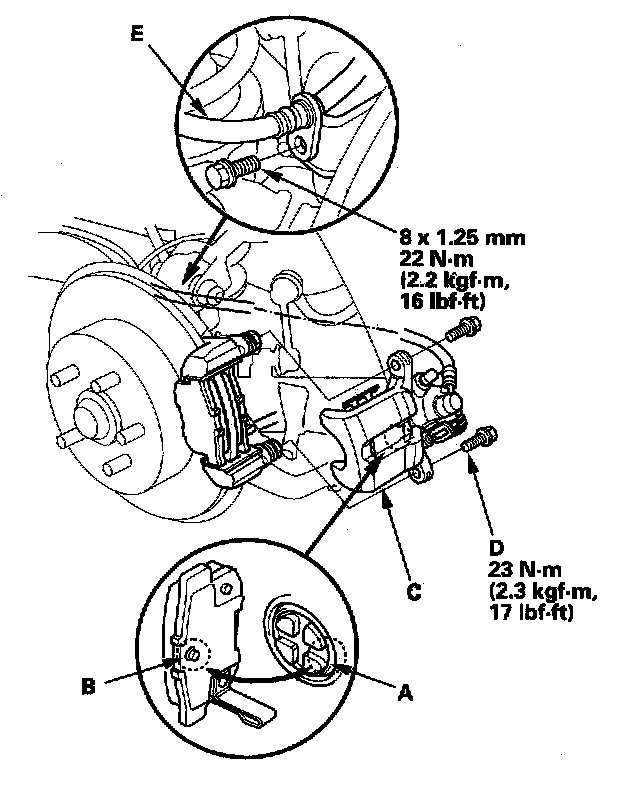 2. Remove the caliper bolts (C), and remove the caliper (D) from the caliper bracket.