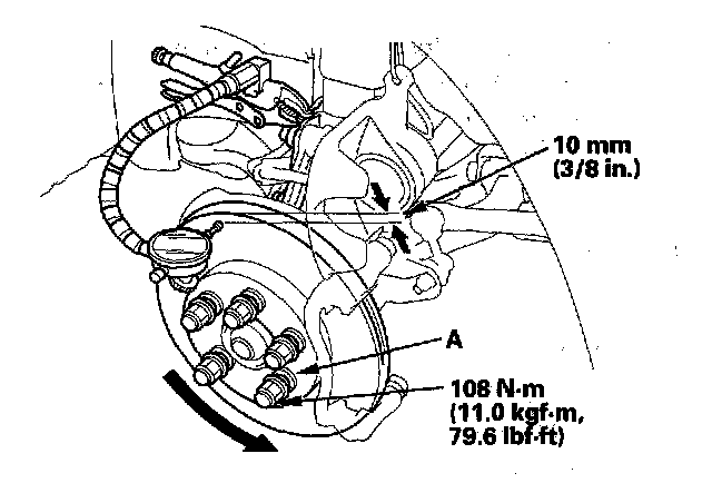 4. Install suitable flat washers (A) and wheel nuts, and tighten the nuts to the specified torque to hold the brake disc securely against the hub.
