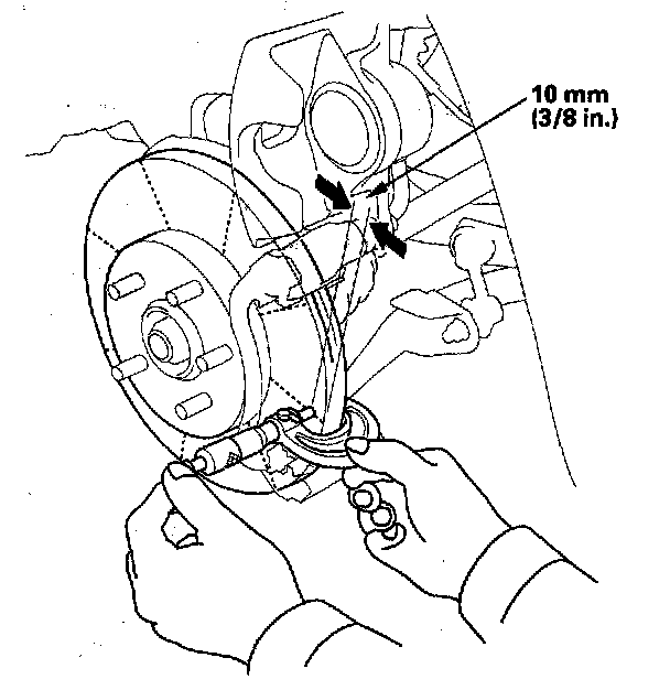 5. Set up the dial gauge against the brake disc as shown, and measure the runout at 10 mm (3/8 inch) from the outer edge of the brake disc.