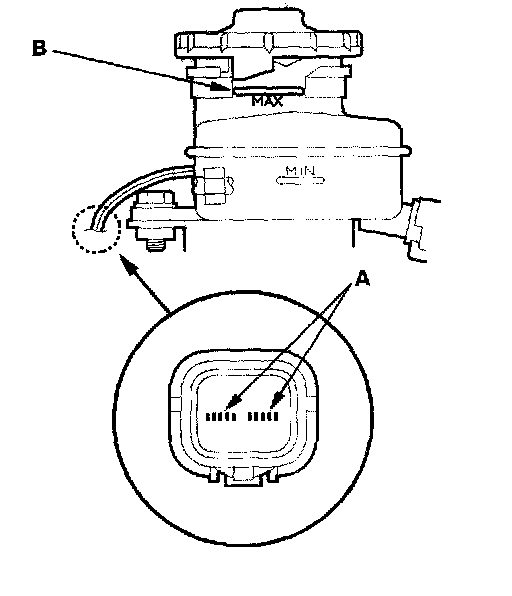 ^ Fill the reservoir with brake fluid to MAX (upper) level (B). With the float up, there should be no continuity.
