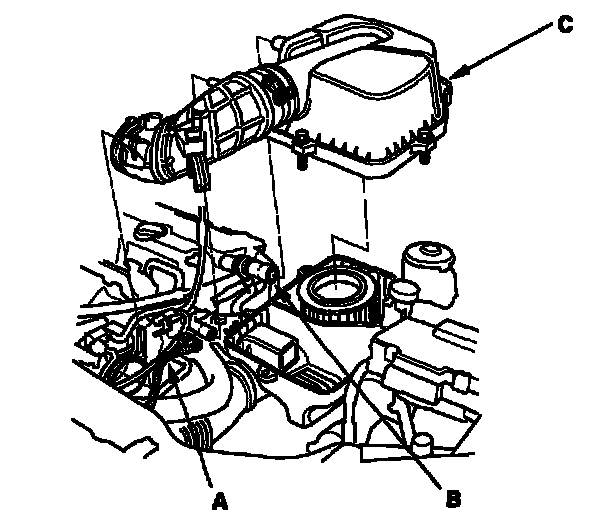 2. Remove the evaporative emission (EVAP) canister hose (A), brake booster vacuum hose (B), and vacuum hoses (C).