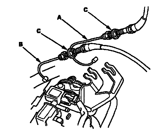 4. Fully open the throttle link and cruise control link by hand, then remove the throttle cable (A) and cruise control cable (B) from the links. Loosen the locknuts (C), and remove the cables from the bracket.
