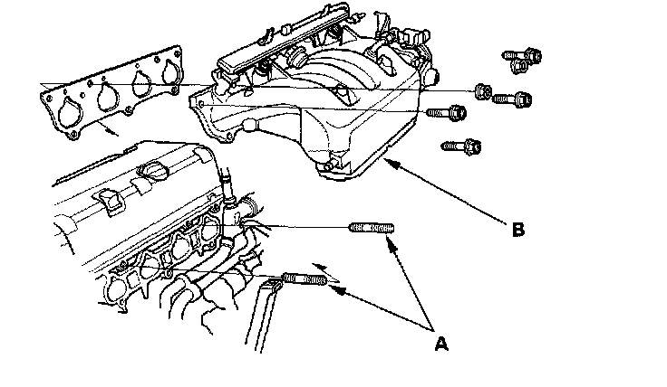12. Remove the two stud bolts (A), then remove the intake manifold (B).