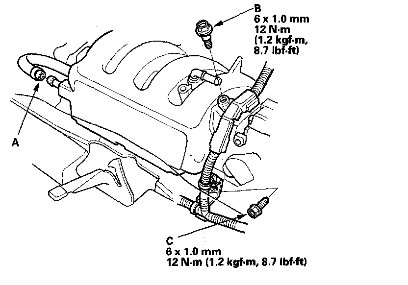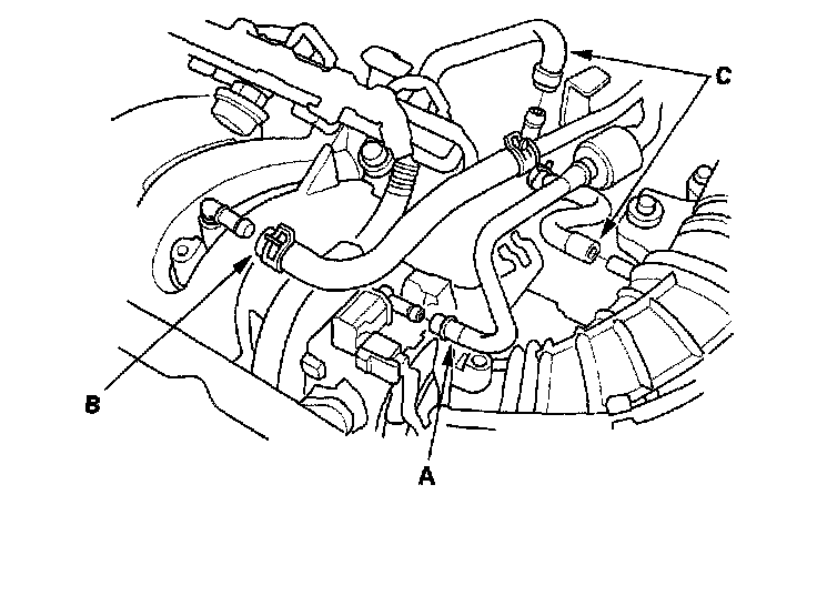 11. Install the EVAP canister hose (A), brake booster vacuum hose (B), and vacuum hoses (C).