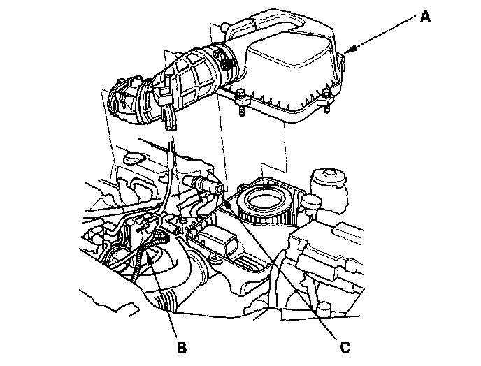 3. Disconnect the intake air temperature (IAT) sensor connector (A), and remove the breather hose (B), then remove the air cleaner housing cover/intake air duct assembly (C).