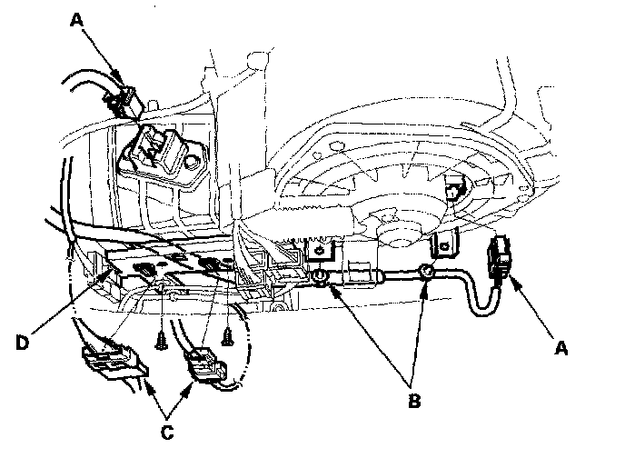 9. Disconnect the connectors (A) from the blower motor and the power transistor, then remove the wire harness clips (B) and the connectors (C). Remove the self-tapping screws and the bracket (D).