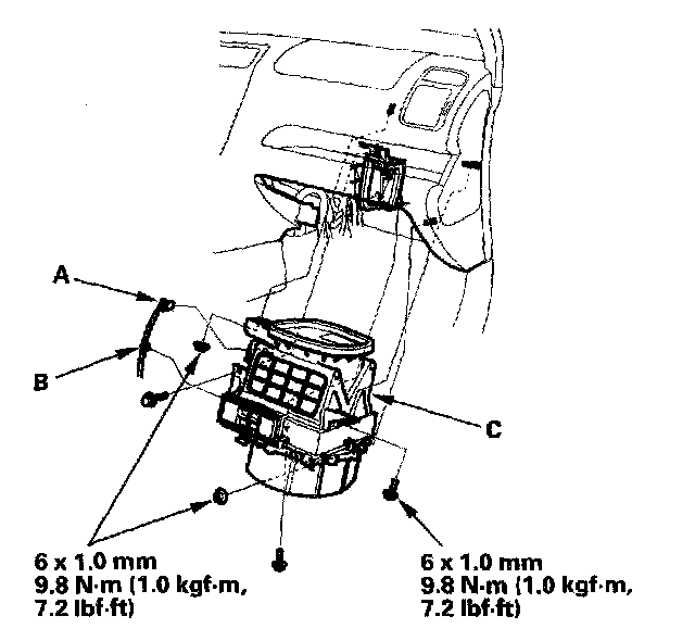 10. Disconnect the connector (A) from the recirculation control motor, then remove the wire harness clip (B). Remove the mounting bolts, the mounting nuts and the blower unit (C).
