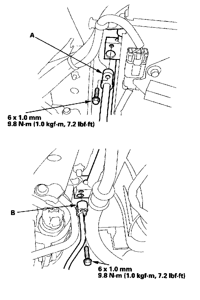 3. Remove the bolts, then disconnect the discharge line (A) and the A/C condenser line (B) from the A/C condenser. Plug or cap the lines immediately after disconnecting them to avoid moisture and dust contamination.