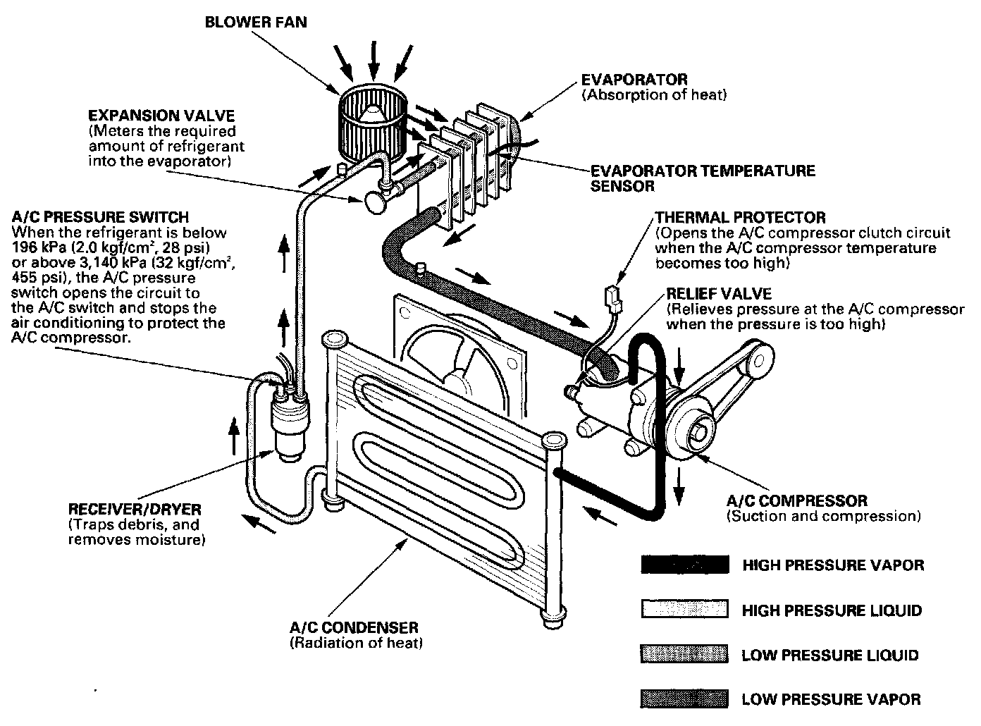 - All A/C system parts (A/C compressor, discharge line, suction line, evaporator, A/C condenser, receiver/dryer, expansion valve, O-rings for joints) are designed for refrigerant R-134a. Do not exchange with R-12 parts.