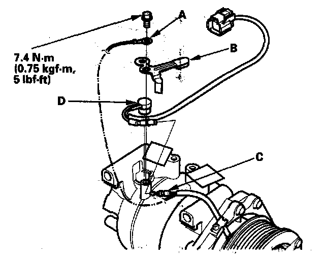 A/C Compressor Thermal Protector Replacement1. Remove the bolt, the ground terminal (A), and the holder (B). Disconnect the field coil connector (C), then remove the thermal protector (D).