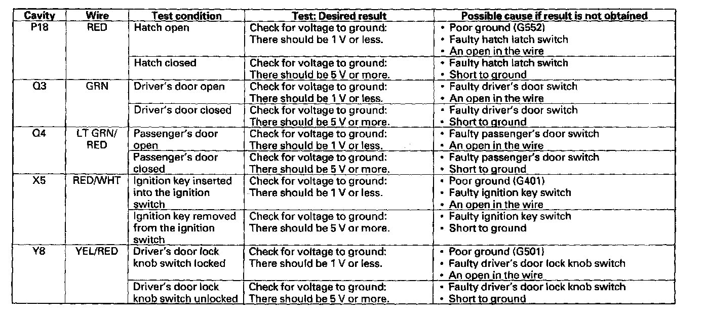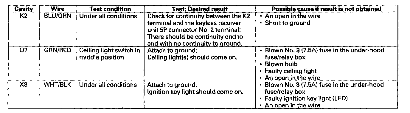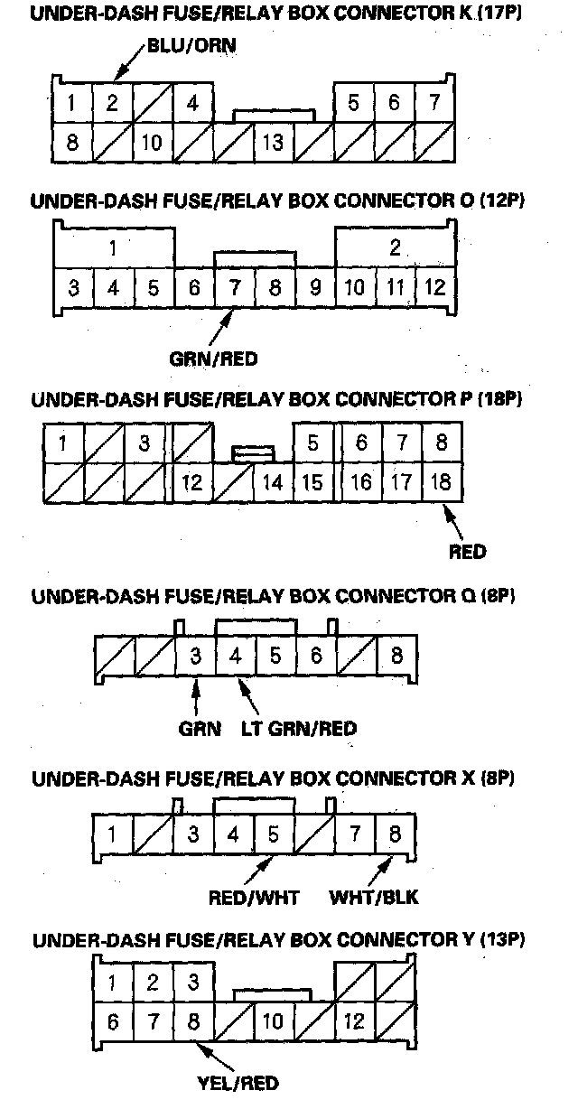 6. Reconnect the connectors to the under-dash fuse/relay box, turn the ignition switch ON (II) to keep the system awake then make these input tests at the appropriate connectors on the under-dash fuse/relay box.