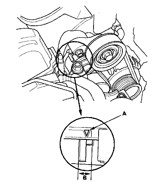 Check that the auto-tensioner indicator (A) is within the standard range (B) as shown. If it is out of the standard range, replace the