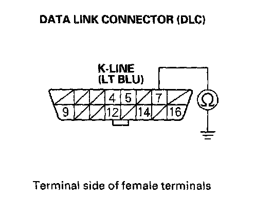 8. Check for continuity between DLC terminal No.7 and body ground.